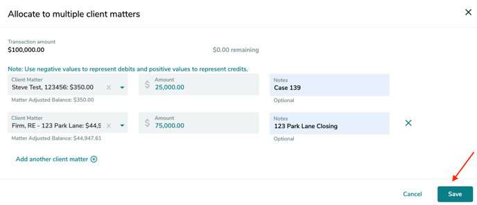 What if I have a transaction that belongs to more than one client? Instructions on how to assign those funds to different client matters.