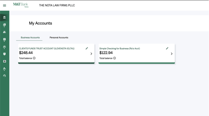Nota is a product/service offered by M&T Bank and is available to attorneys whose offices and practices are in NY, NJ, MD, PA, DE, CT, VA, DC, NH, MA, ME, VT, FL, or WV. IOLTA accounts held by lawyers in these states must be subject to applicable state rules and regulations. The advertised product/services and their features and availability are subject to change without notice at any time. Use of the product/service is subject to and governed by certain terms, conditions, and agreements required by M&T Bank.